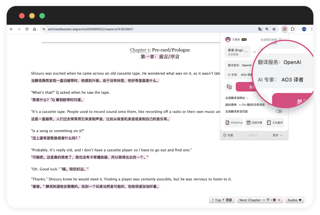 Pour répondre aux besoins spécifiques de la communauté AO3, nous avons développé un expert en traduction AI innovant pour AO3. Vous pouvez l'utiliser dans des services de traduction AI supportant l'immersion, tels que OpenAI, Claude, Gemini. Nous nous engageons à fournir aux amateurs de AO3 une expérience de lecture plus précise et fluide.